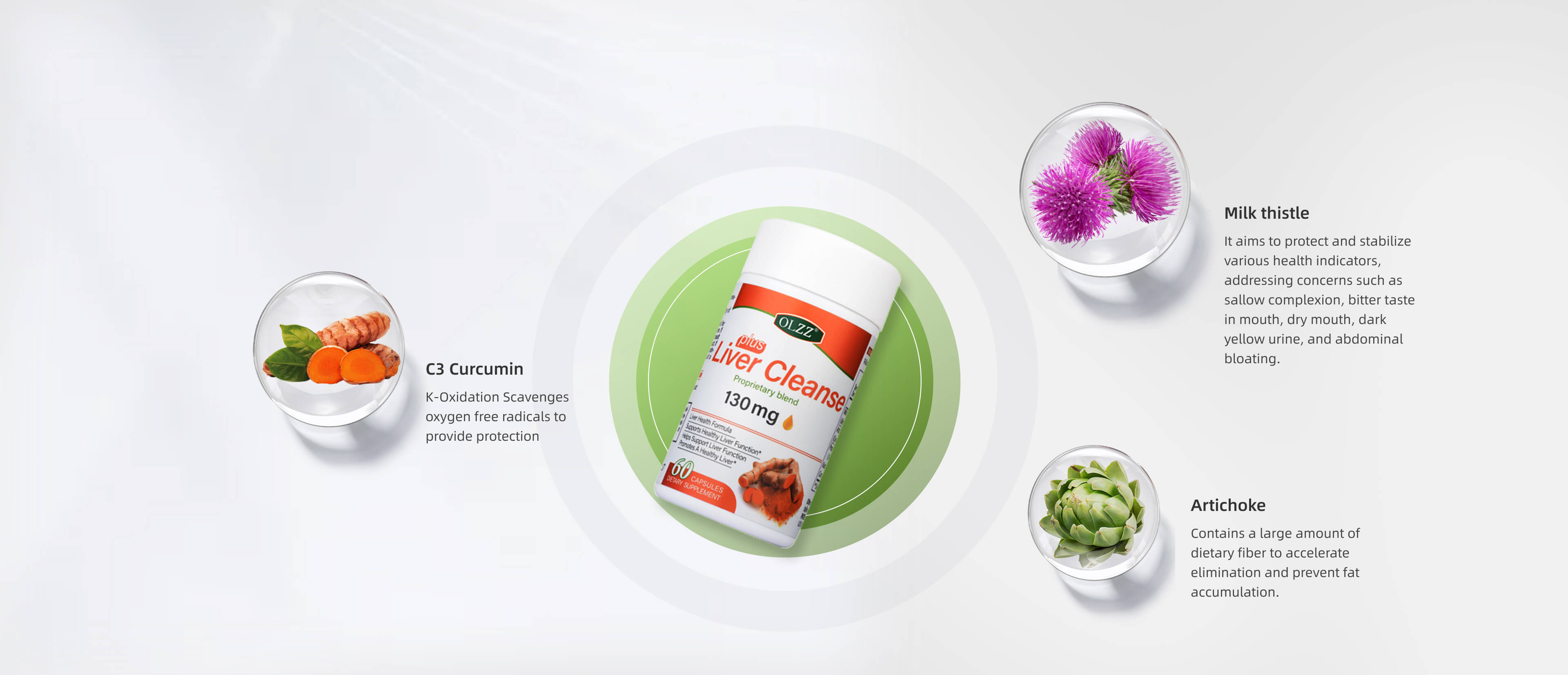 Active Ingredients: Milk Thistle Extract, Artichoke Extract, and a Proprietary Blend (Choline Bitartrate, Kudzu Root Extract, Curcumin C3 Complex®). Other Ingredients: Resistant Dextrin, Microcrystalline Cellulose, Gelatin, Purified Water
