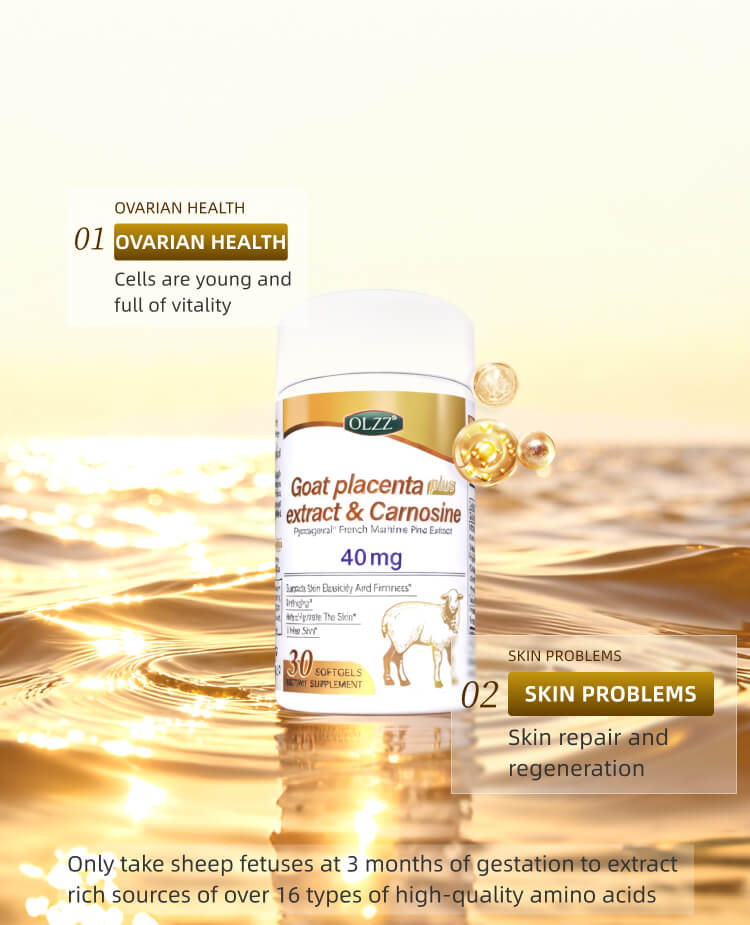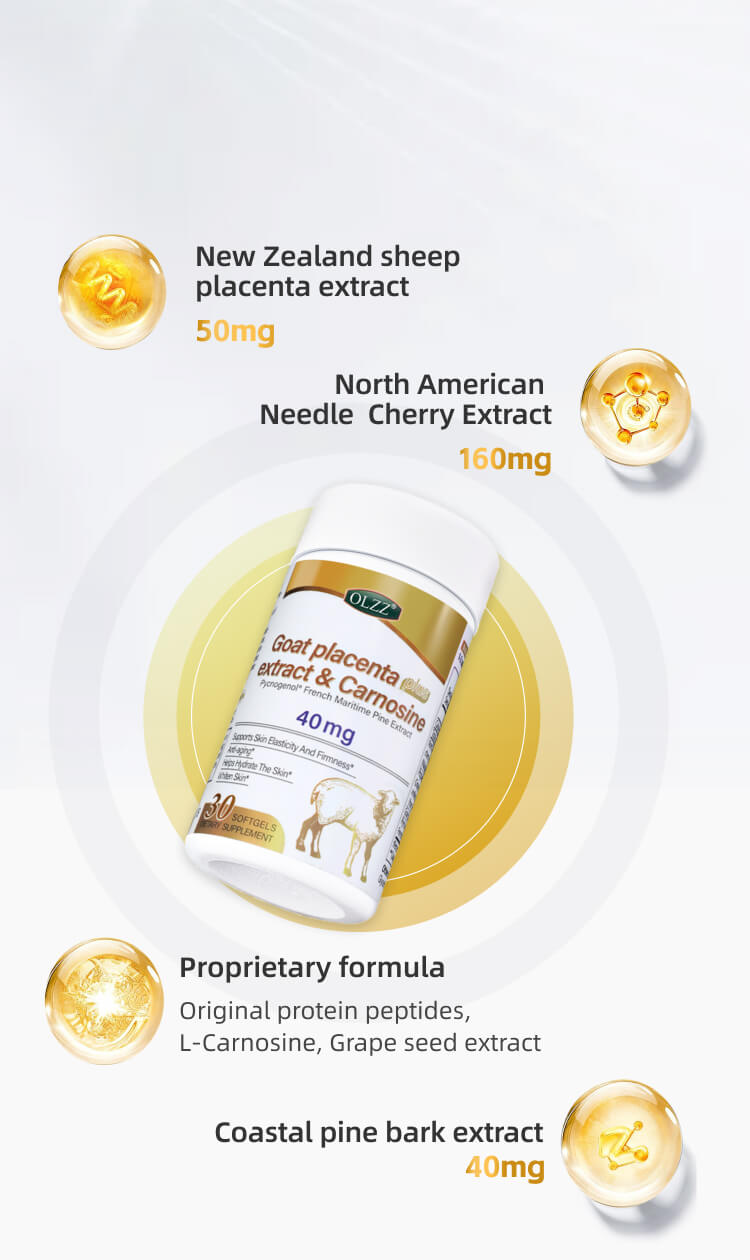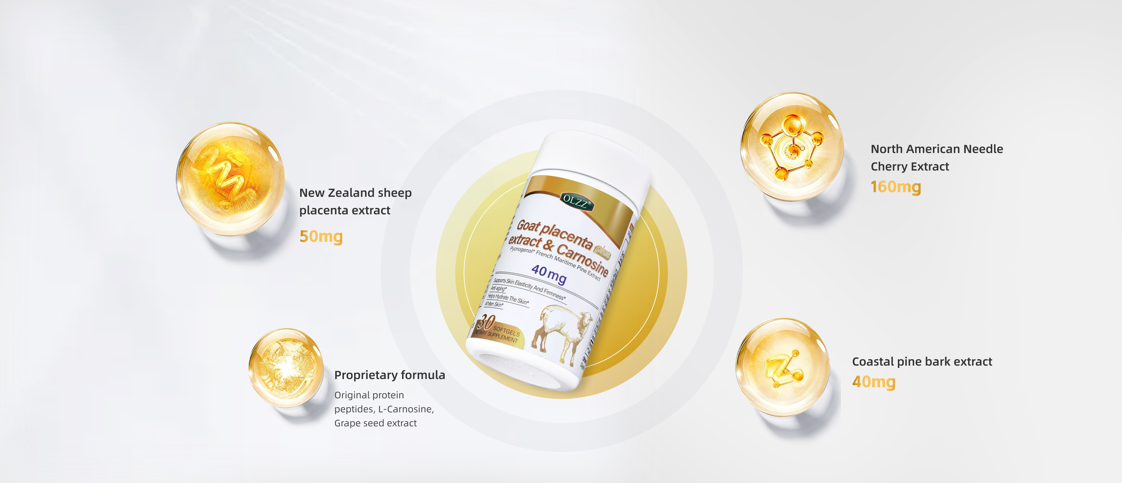 Active Ingredients: Pycnogenol® (French Maritime Pine Bark Extract), Acerola Cherry Extract (160mg), and a Proprietary Blend containing Grape Seed Extract, Fish-derived Collagen Peptides, L-Carnosine (150mg), and Goat Placenta Extract Powder (50mg). Other Ingredients: Soybean Oil, Beeswax, Gelatin, Glycerin, Purified Water