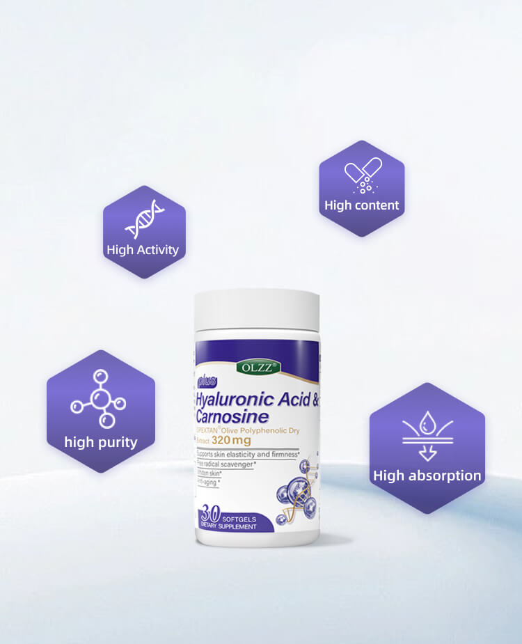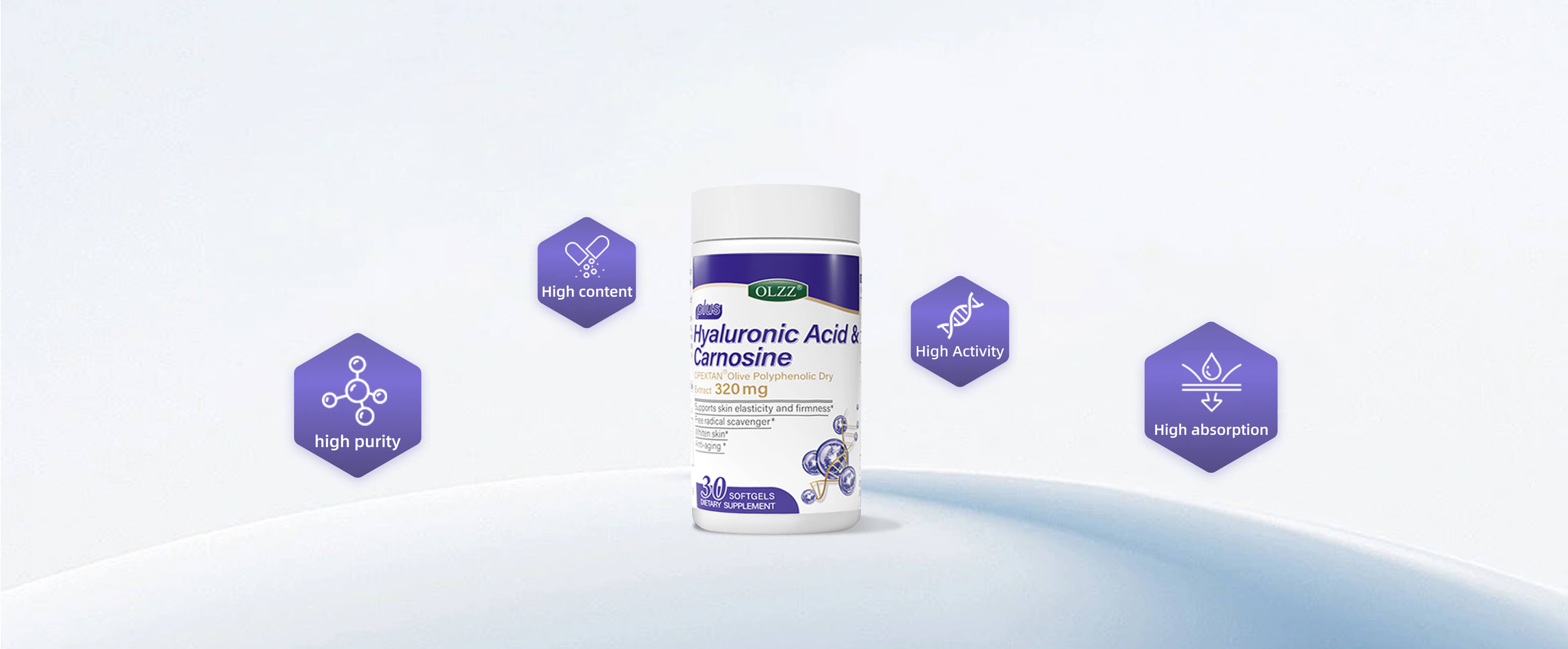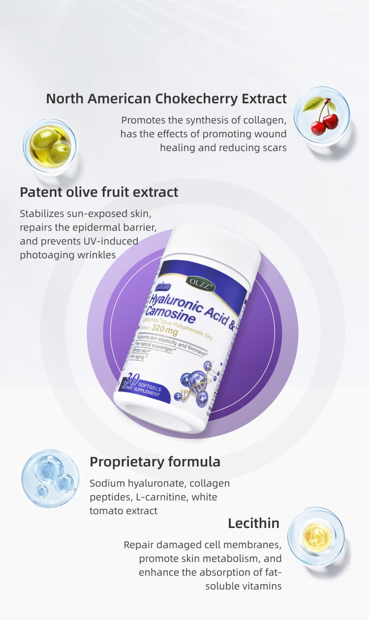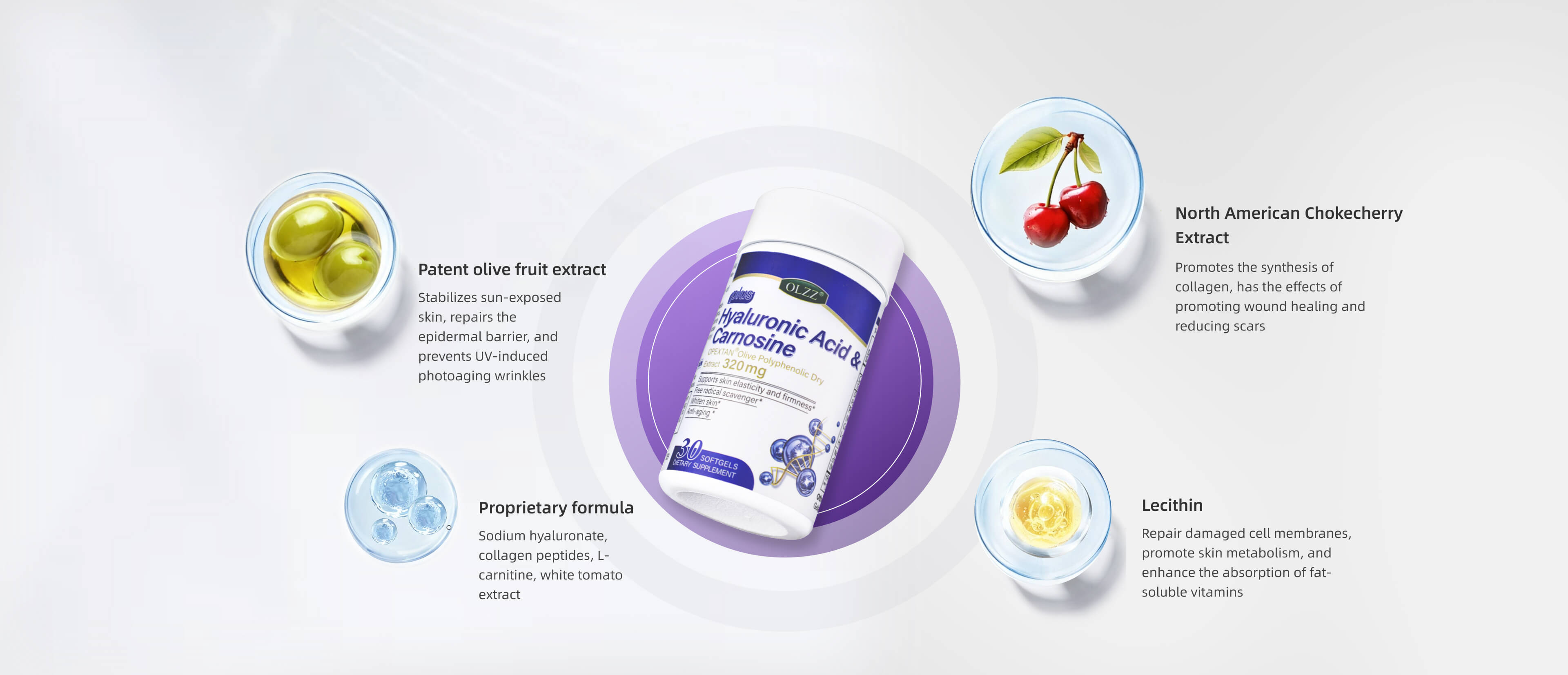 Active Ingredients: Patent Olive Fruit Extract (160mg/capsule), North American Acerola Cherry Extract (40mg/capsule), and a Proprietary Blend (100mg/capsule) of White Tomato Extract, Fish-derived Collagen Peptides, L-Carnosine, and Sodium Hyaluronate. Other Ingredients: Soybean Oil, Beeswax, Lecithin, Gelatin, Glycerin, Purified Water
